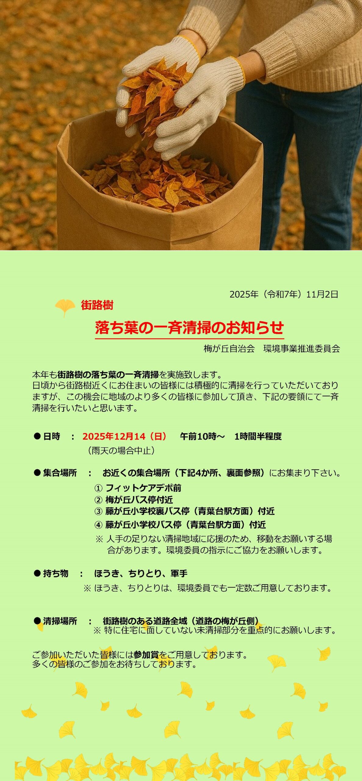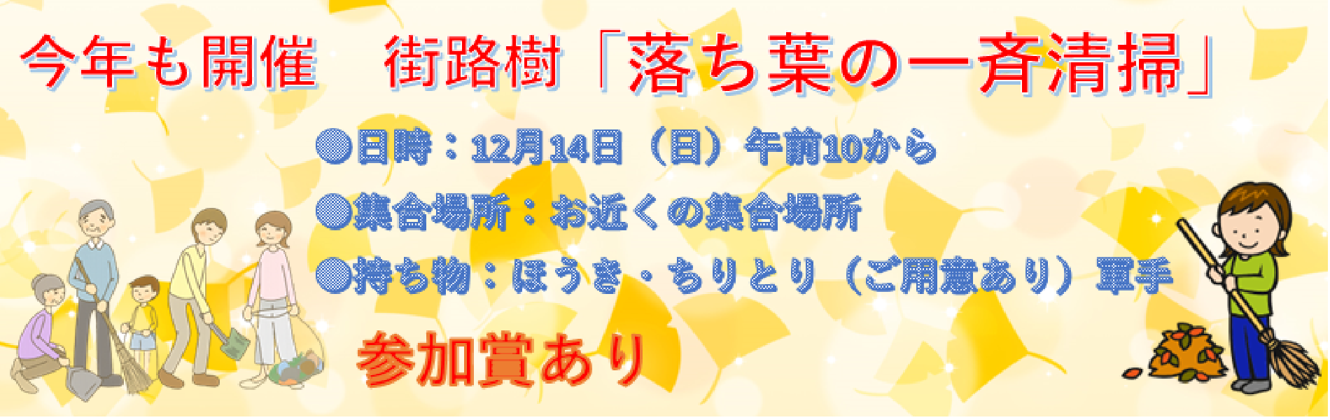 ■11月の公園清掃 11月16日(日)9時~ ・第一公園 1A-2 ・第二公園 6A-28、6B-31 ・第三公園 8A-34 ■12月の公園清掃 12月21日(日)9時~ ・第一公園 1A-7 ・第二公園 2B-18、2B-19、3A-19、3A-22 ・第三公園 8A-35、8B-35