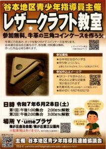 2025年6月4日 / 最終更新日時 : 2025年10月17日 仮屋ホームページ担当 過去の投稿 レザークラフト教室開催のお知らせ(谷本地区青少年指導員) 6月28日(土)午後2回、梅が丘自治会集会所(Y・umeプラザ)にてレザークラフト教室を開催します。一緒に牛革のコインケースを作ってみませんか。
