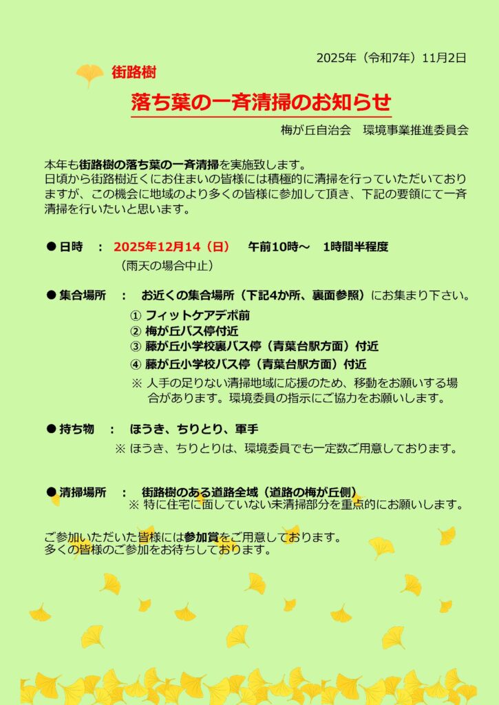 2025/12/14 「街路樹 落ち葉の一斉清掃」のお知らせ